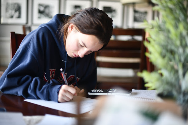 Avery is very busy with top-level classes and working usually six days a week. Its challenging, but she's also learning vital time management skills. I sat across from her and addressed Christmas cards.